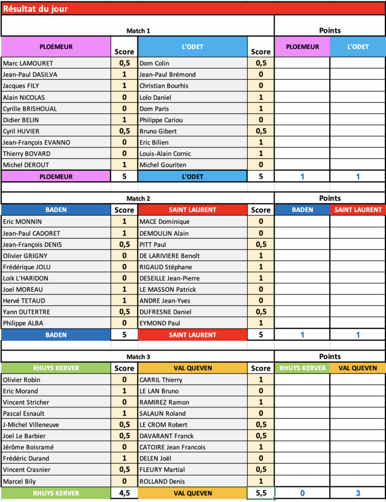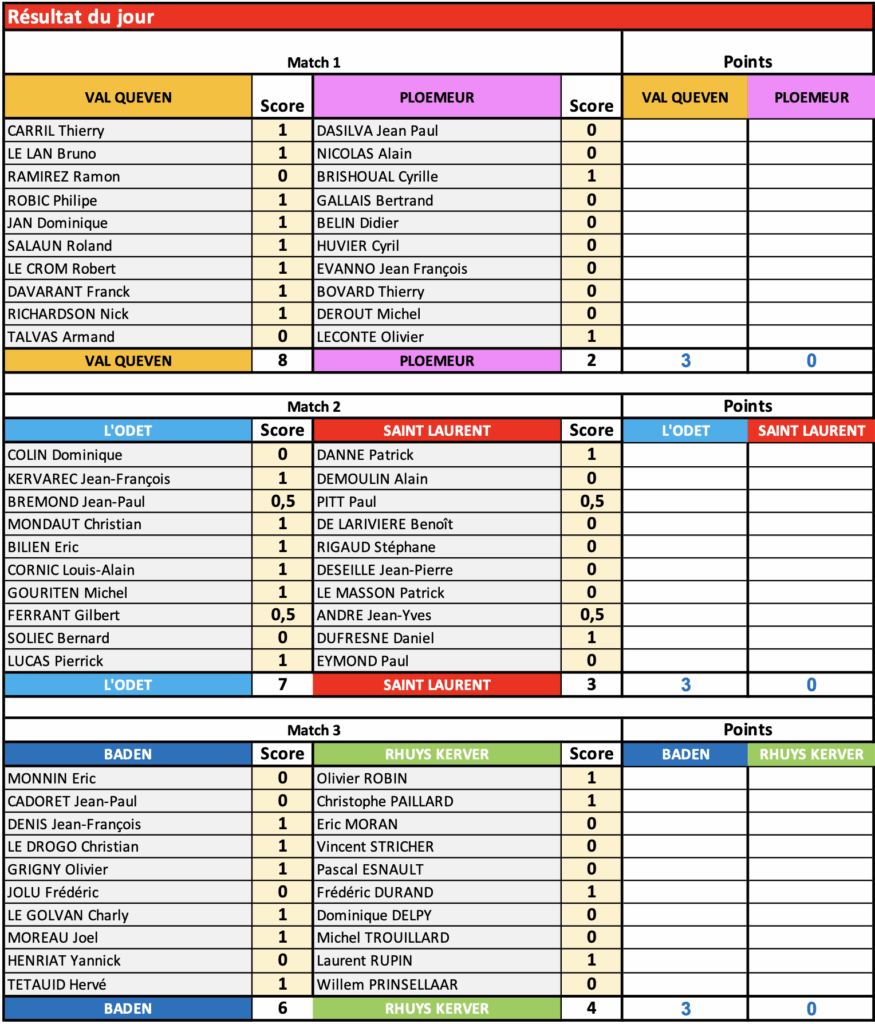 Les conditions n’ont pas permis de finir les 18 trous. Dommage, QuĂ©ven menait 9 matchs sur 10. Un report est encours d’organisation.